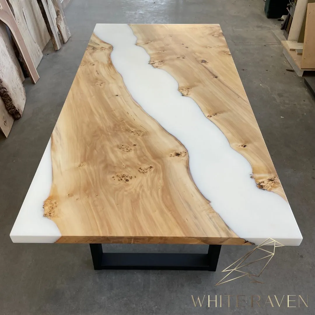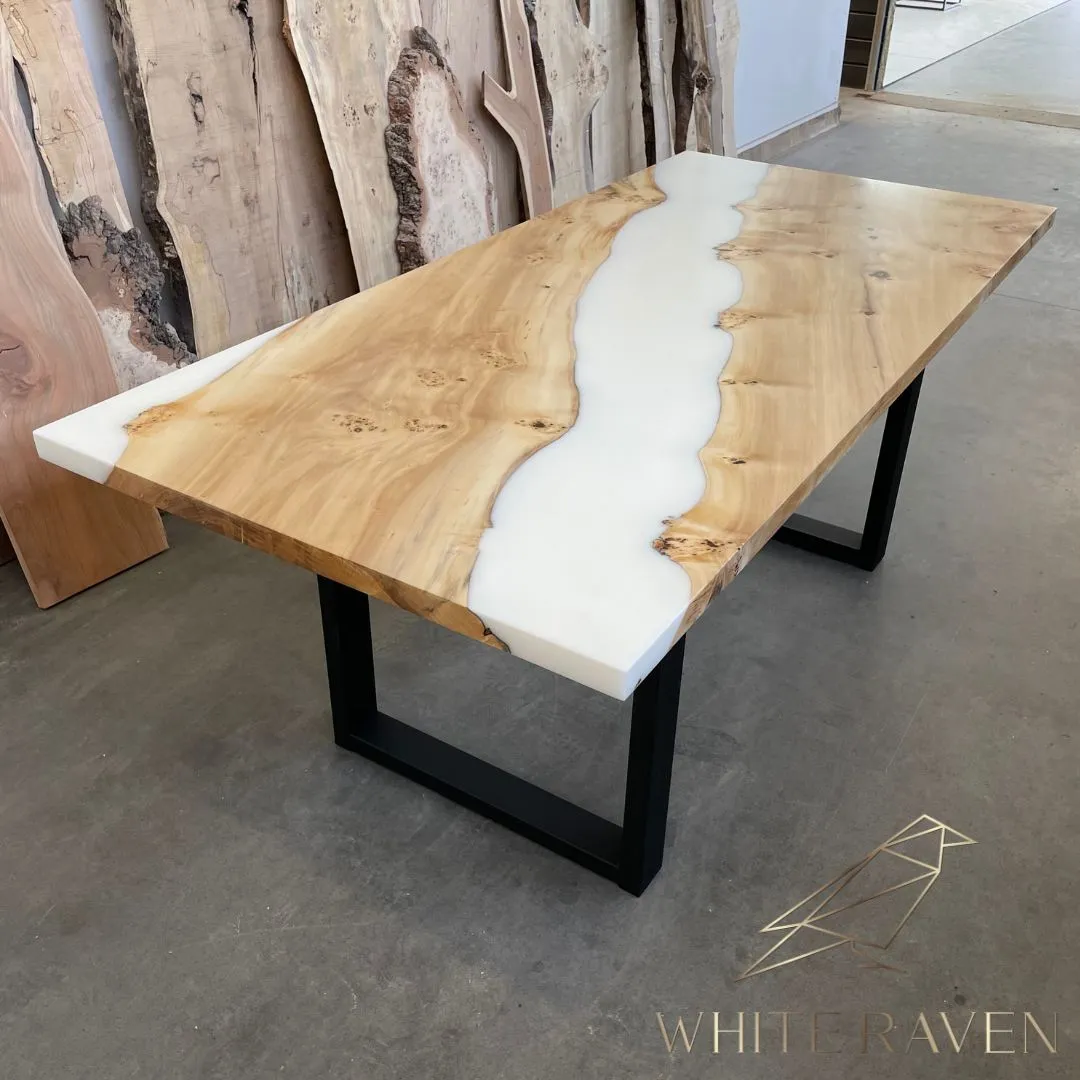 Biały stół WHITE RIVER to niezwykłe połączenie elegancji i naturalnego piękna. Głównym elementem, który wyróżnia stół, jest jego blat wykonany z litej deski drewna topoli z czeczotą, podkreślający autentyczność i ciepło naturalnego materiału. Dodatkowo, efektowne zastosowanie pełnej żywicy epoksydowej o białym kolorze nadaje stołowi niepowtarzalny wygląd.