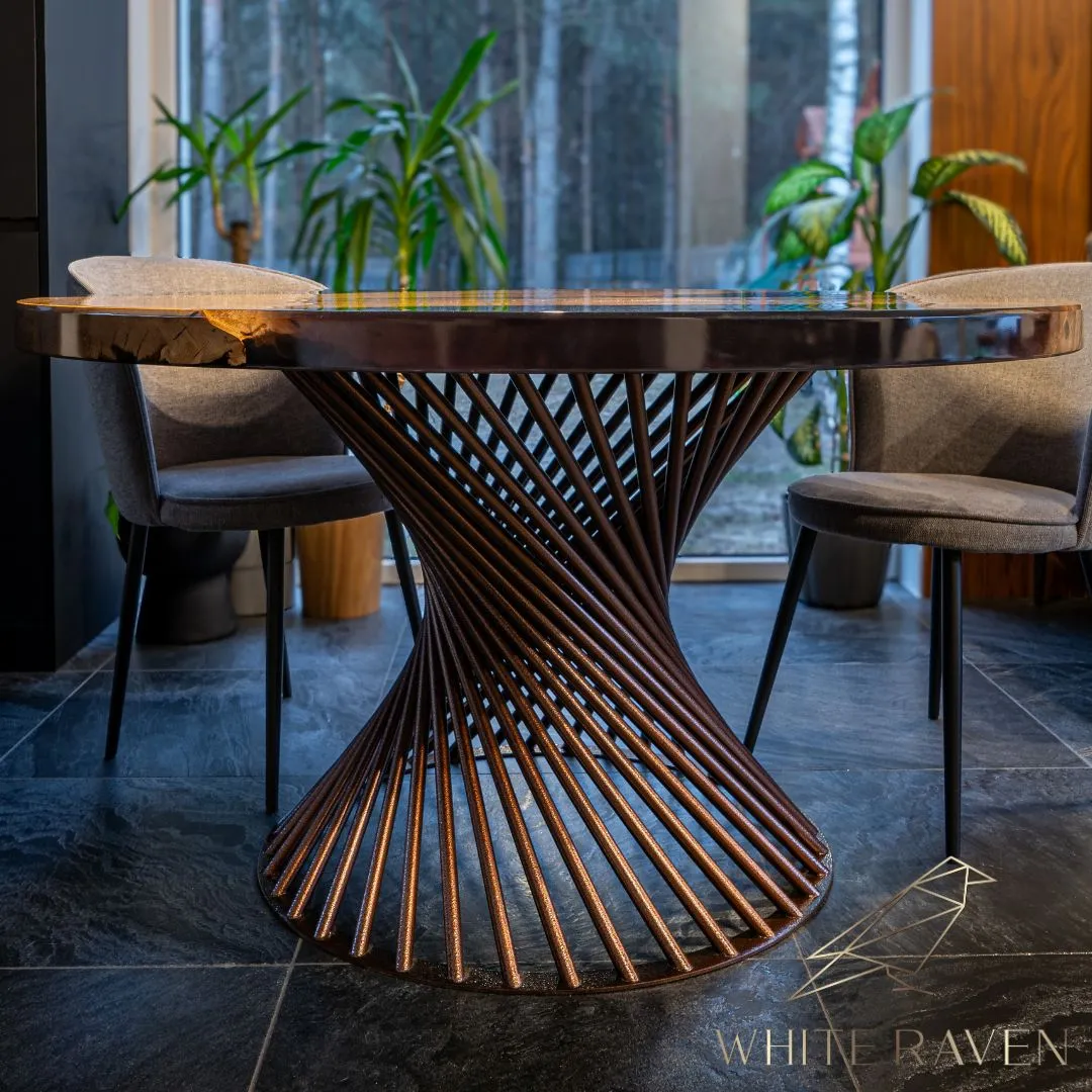 Wyróżniając element konstrukcji to stelaż typu „tornado”, wykonany z młotkowanej stali w odcieniu miedzi. Ta nietypowa, rzeźbiarska forma zapewnia pełną stabilność, a jednocześnie nie ogranicza przestrzeni podczas użytkowania.