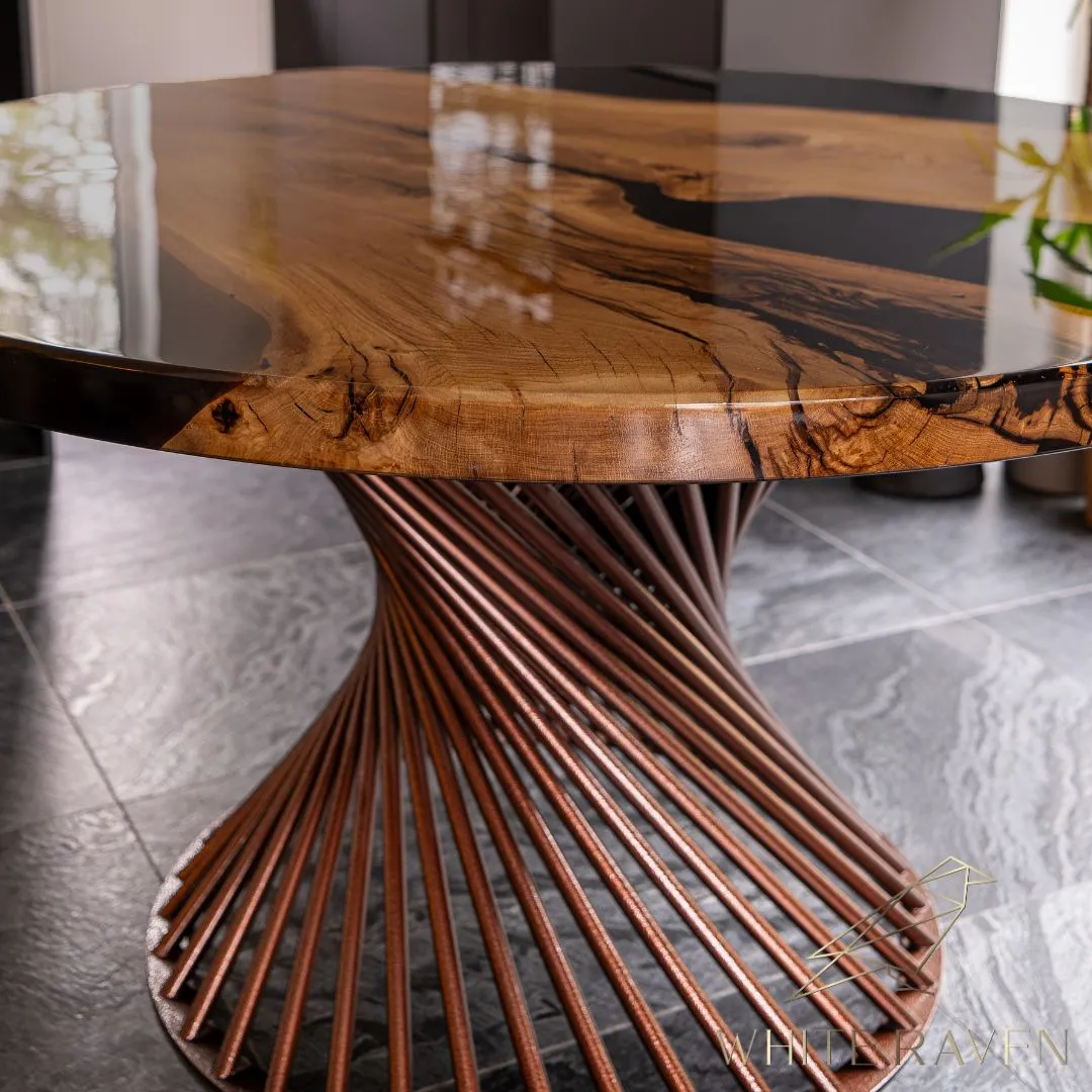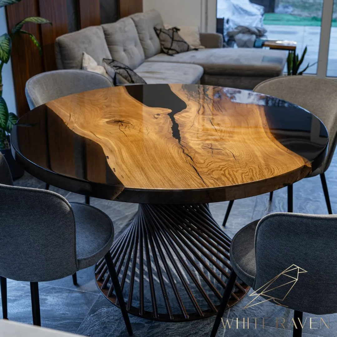 Blat wykonany z litej deski drewna dębowego, które zachwyca swoim ciepłym wybarwieniem i charakterystycznym rysunkiem słojów. Centralną część blatu wypełnia transparentna żywica epoksydowa o delikatnym szarym odcieniu, nadająca stołowi nowoczesnego, eleganckiego wyrazu. Z kolei czarna, malowana od spodu powierzchnia tworzy efekt głębi i wyrazistego kontrastu, podkreślając trójwymiarowość kompozycji.