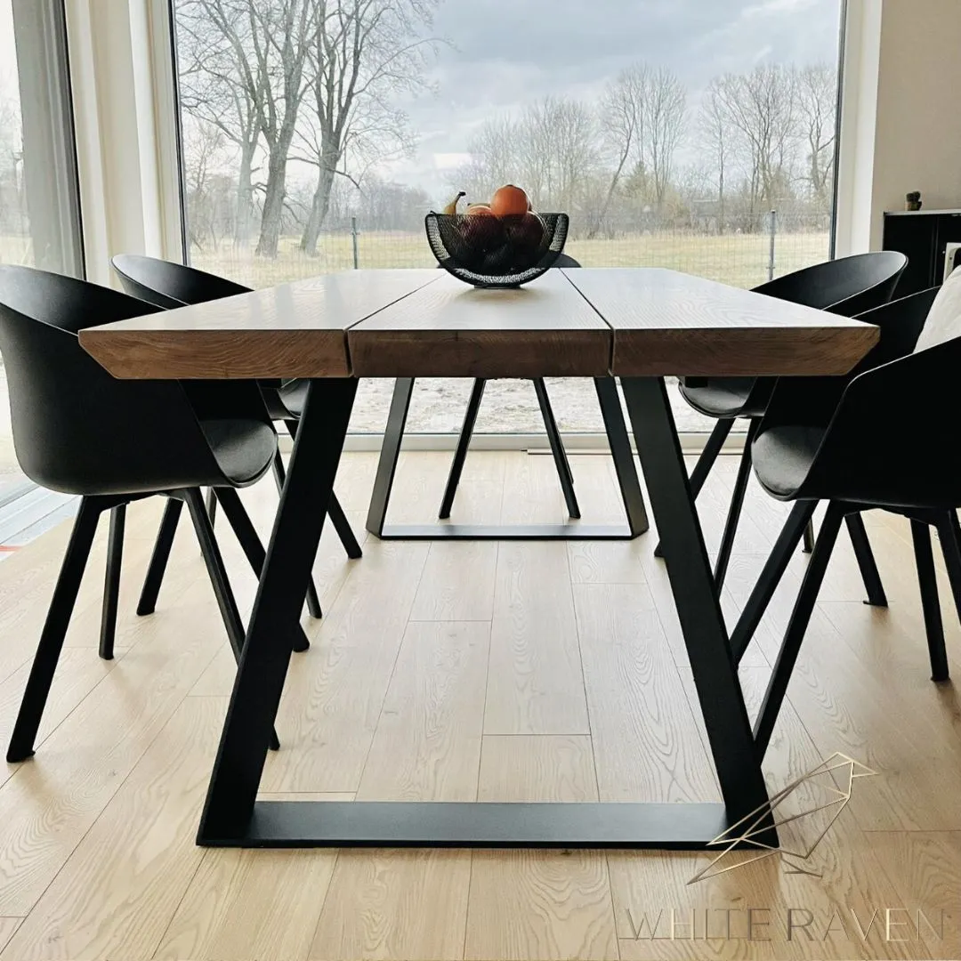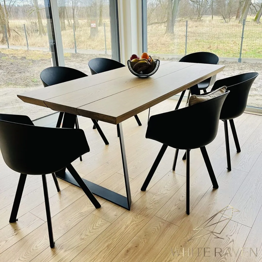 Stół wspiera się na stabilnych nogach z metalowego płaskownika w kształcie trapezu, które nadają mu nowoczesny, loftowy charakter. Ich przemyślana konstrukcja zapewnia pełen komfort użytkowania – bez ograniczania przestrzeni pod blatem.