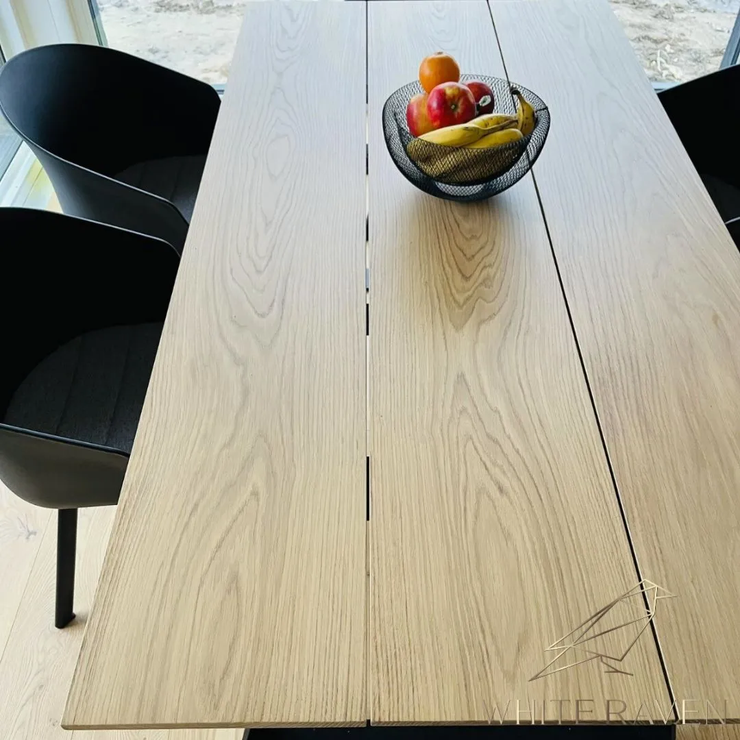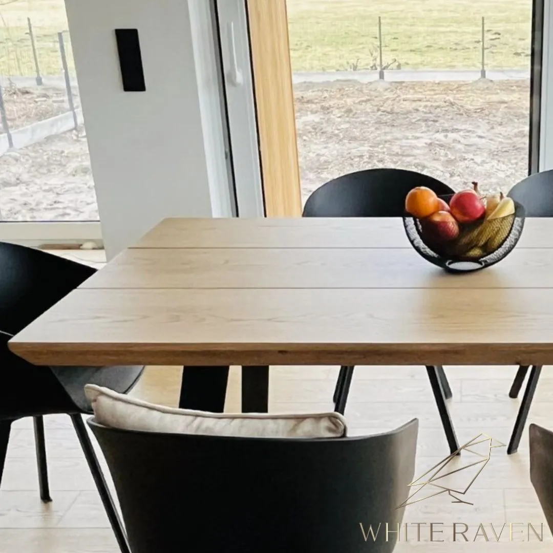 Dla zachowania trwałości i estetyki blat został pokryty matowym lakierem ochronnym, który nie tylko zabezpiecza powierzchnię przed zarysowaniami i wilgocią, ale także wydobywa naturalne piękno dębu. Dzięki temu stół jest łatwy w pielęgnacji i odporny na codzienne użytkowanie.